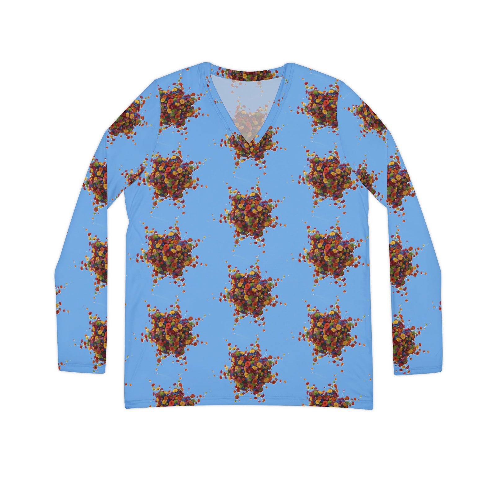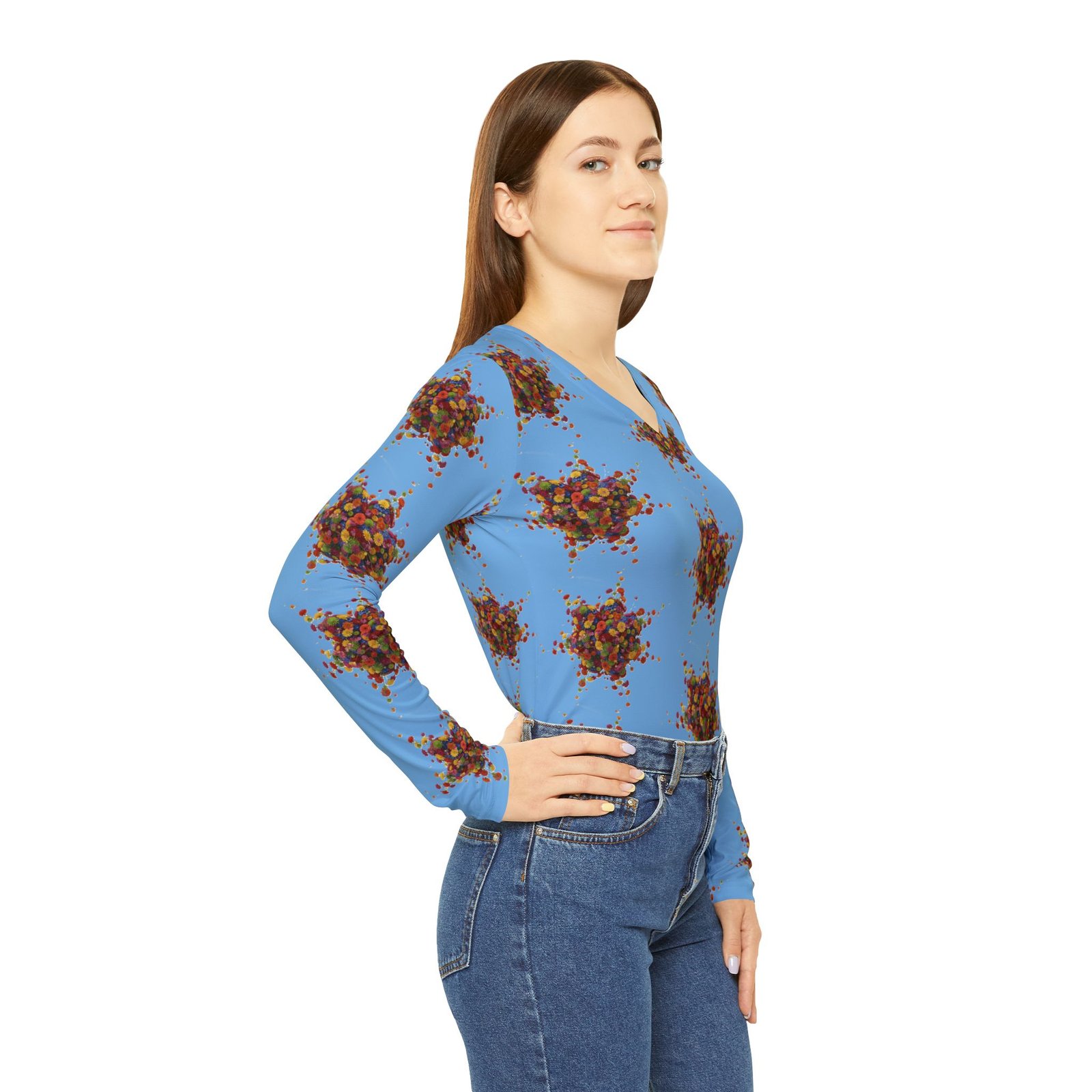 Women’s Long Sleeve V-neck Shirt with Colorful Floral Print – Blue